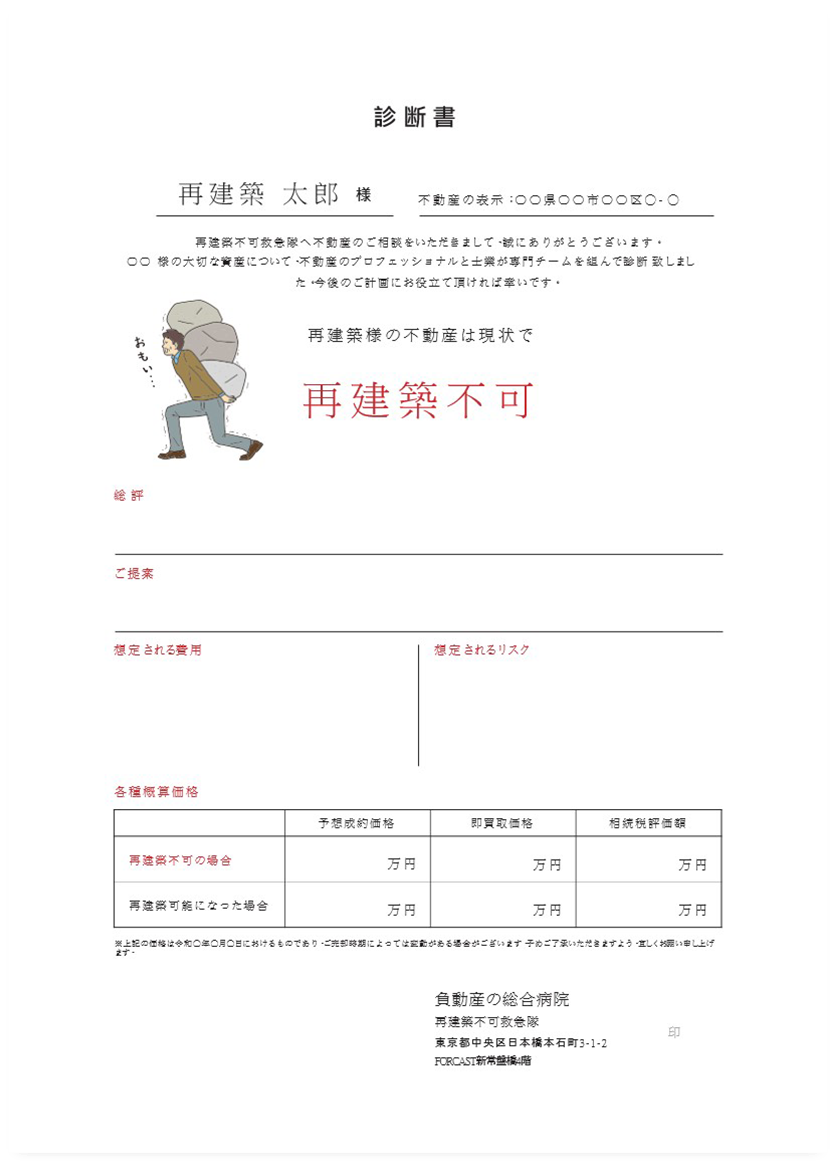 『負動産の総合病院』の一部門である「再建築不可救急隊」は、次の世代に負動産で争いを残すこと無く価値ある資産(富動産)を残す、そのお手伝いをさせていただきます。